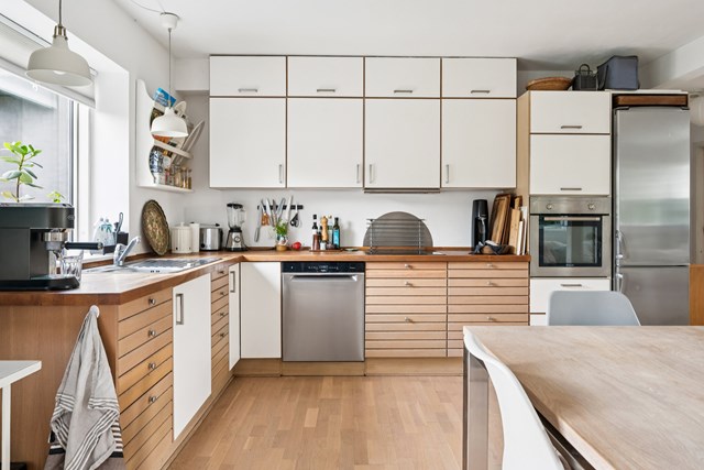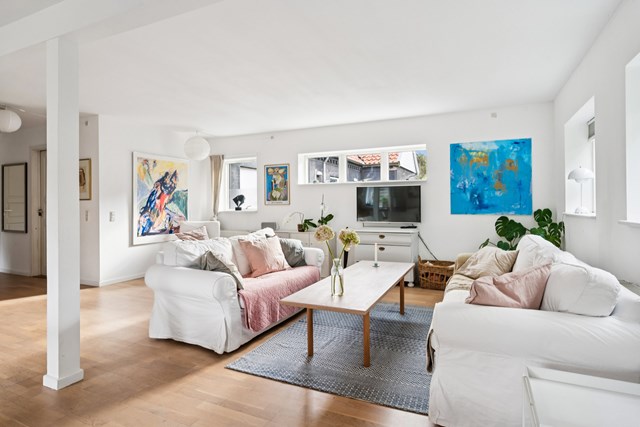 Det lyse trægulv og de store vinduespartier giver et skønt lysindfald, og detaljerne vidner om kvalitet og omhu i renoveringen. Her får man følelsen af hjem med det samme.